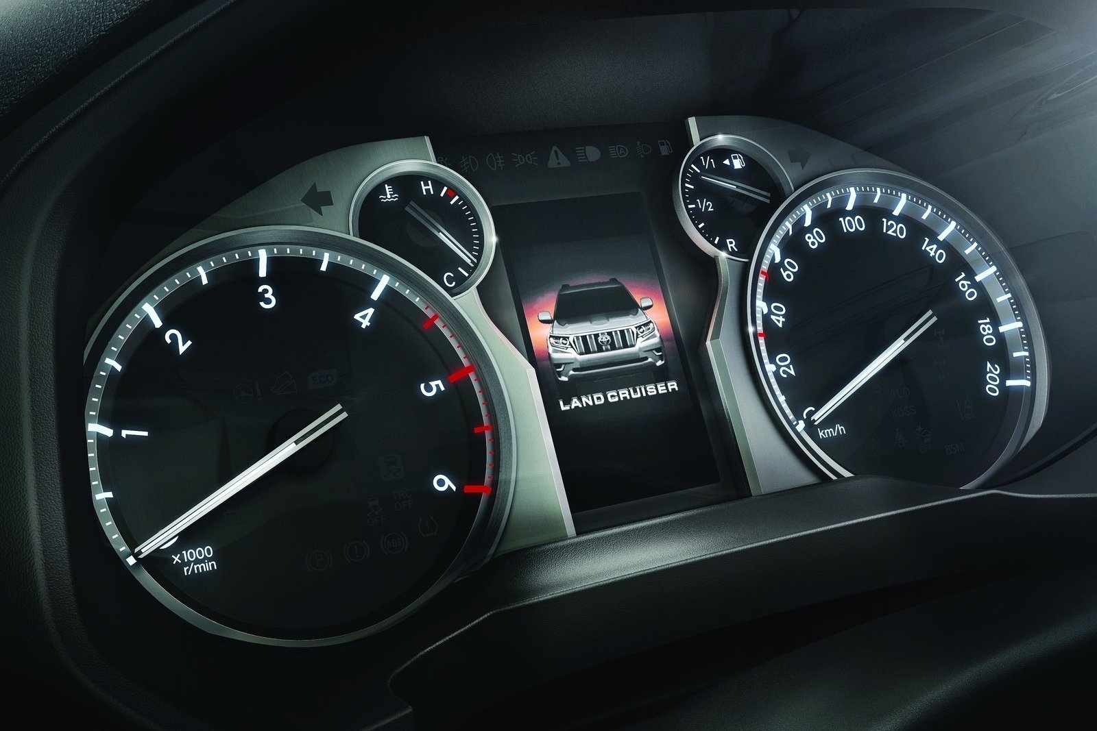 Дизайн главных органов управления Прадо полностью пересмотрен, хотя архитектура передней панели осталась прежней: сверху вниз это мультимедиа-система, органы управления климатической установкой, блок управления полным приводом и внедорожным арсеналом. Сенсорный экран теперь 8-дюймовый, «климат» лишился «крутилок», а настройки трансмиссии регулируются шайбой (вместо прежних качающихся переключателей). Обе ниши внизу прикрыты крышками. Руль выглядит более современно из-за непараллельных нижних спиц.